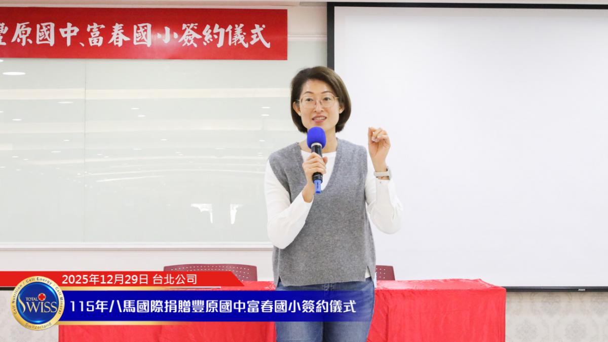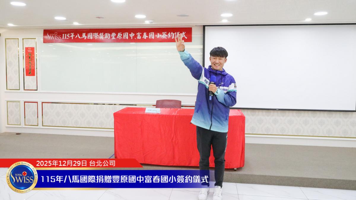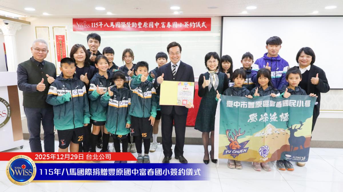 2025 年 12 月 29 日,在百萬抽獎及健康講座之後,台北公司現場隨即舉行 Total Swiss 第五次贊助富春國小飛盤隊,以及第二次贊助豐原國中飛盤隊的簽約儀式。富春國小小選手由吳夢竹校長親自領隊參加;豐原國中及常春藤中學的學長們,則由台中市議員邱愛珊領隊出席。