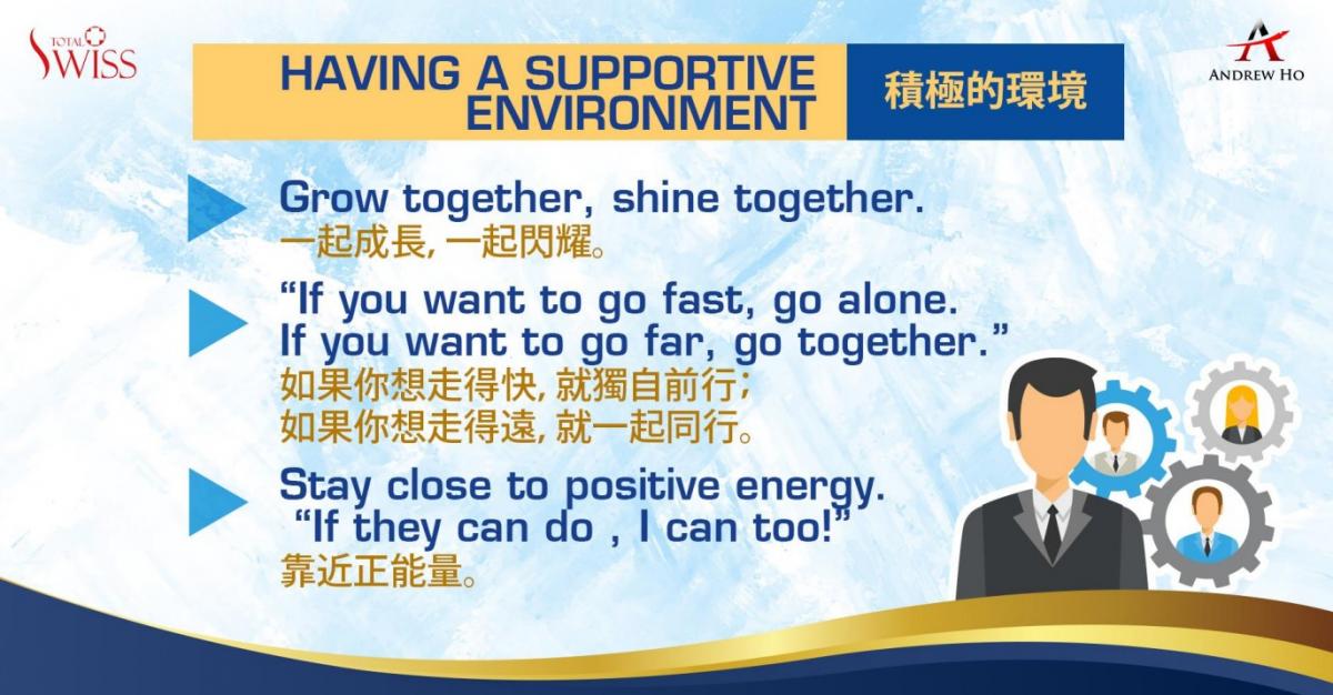 積極的環境 「如果你想走得快,就獨自前行;如果你想走得遠,就一起同行。」身邊的人是土壤,你是種子。選擇積極、支持你的環境,遠離消耗你能量的人。正能量會傳染,當你身邊都是相信「我做得到」的人,你也會更容易做到。