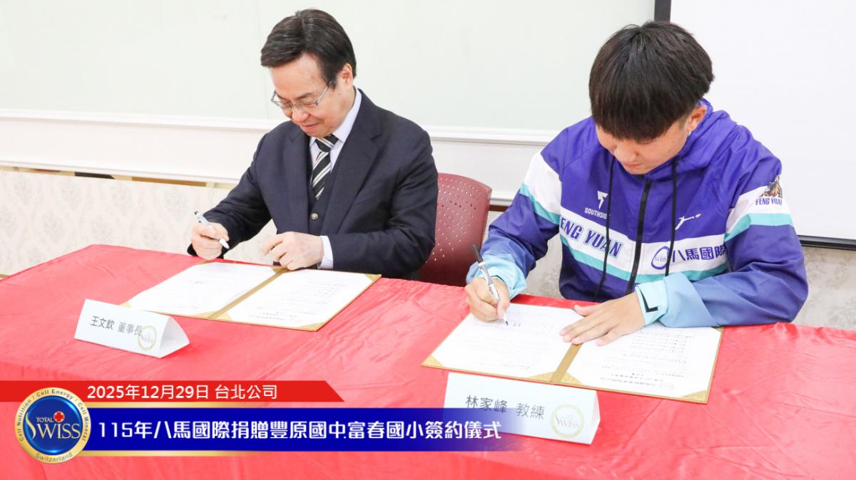 2025 年 12 月 29 日,在百萬抽獎及健康講座之後,台北公司現場隨即舉行 Total Swiss 第五次贊助富春國小飛盤隊,以及第二次贊助豐原國中飛盤隊的簽約儀式。富春國小小選手由吳夢竹校長親自領隊參加;豐原國中及常春藤中學的學長們,則由台中市議員邱愛珊領隊出席。