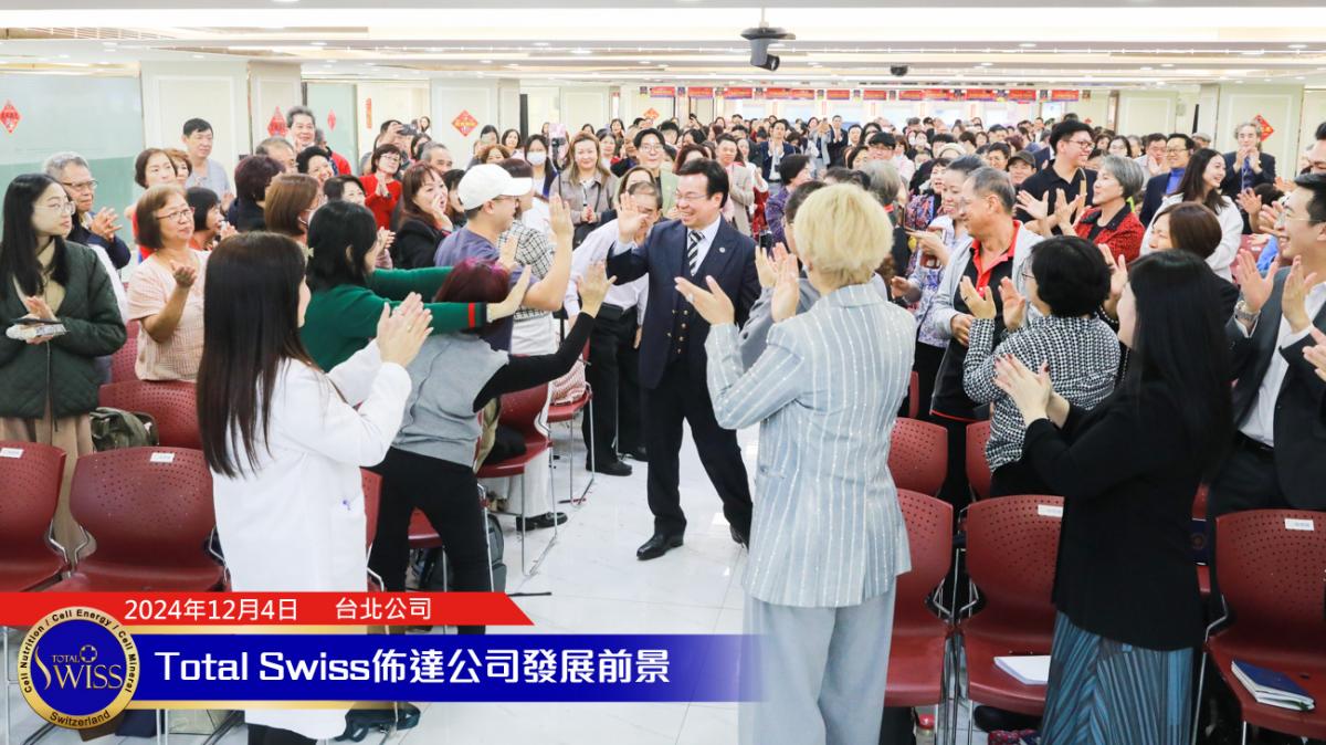2024年Total Swiss全球頒聘大會於12月4日正式揭開序幕,下午1點30分,在張在心副總、孫守德總裁的引言之後,王博士向齊聚Total Swiss台北公司七樓跟二樓,來自全球16個市場的一千多位領導人,詳細闡述了別人想學也學不來,想追也追不上的未來五年六大願景。