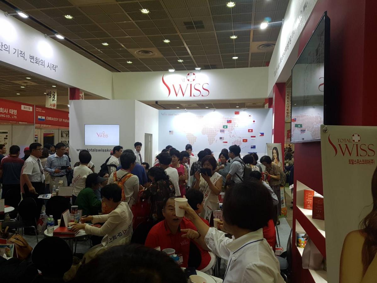 2018年8月16日(週四),韓國COEX展覽會隆重登場,Total Swiss韓國公司的展覽攤位一早就擠進滿場的人潮;Total Swiss創辦人王文欽博士及韓國總經理宋國柱也從一開展就親自坐鎮現場,跟夥伴及來訪的貴賓洽談。