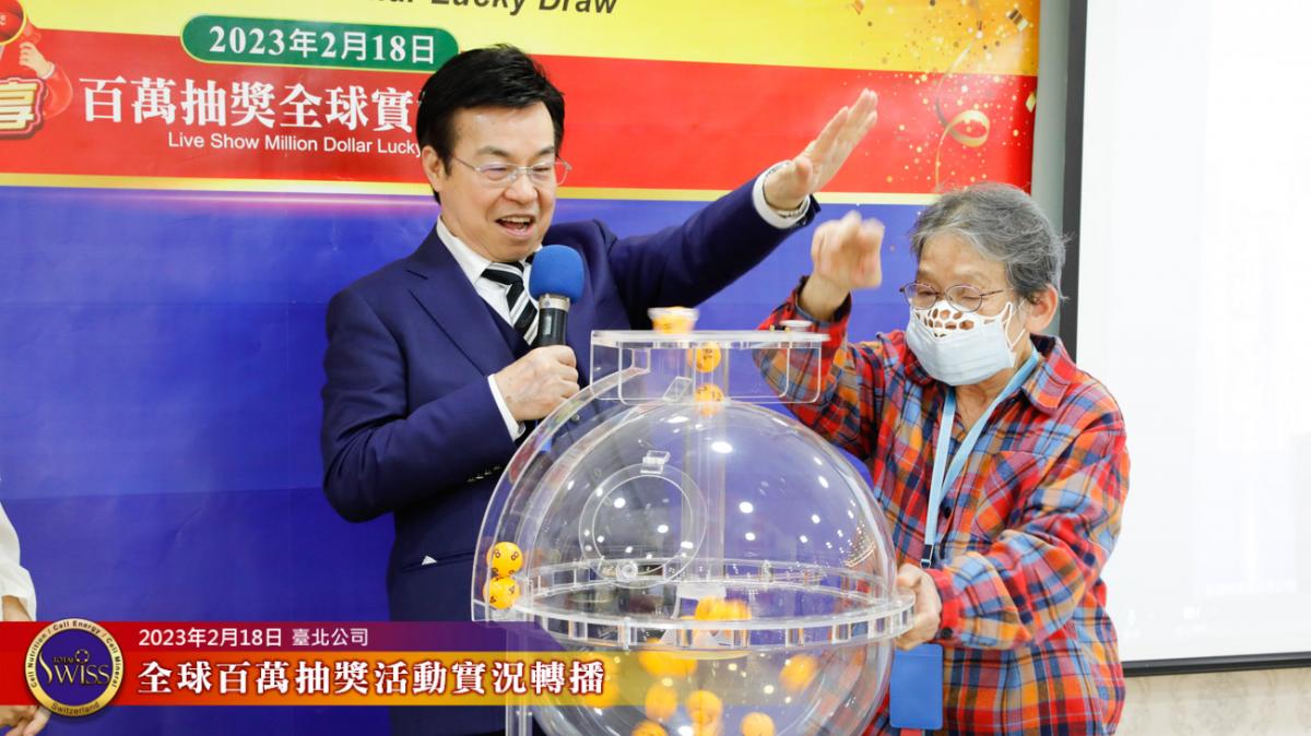 最後,進行「被很多人期待為空號可以累積到200萬的金獎」抽獎,抽出第一個球號之後,王博士從現場邀請一位89歲及一位87歲的長者上台協助抽出第2、第3顆球,然後,王博士再抽出第四顆球。