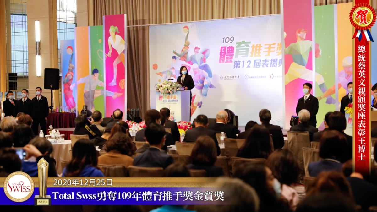 由教育部體育署、中華奧林匹克委員會、體育運動總會主辦的109年第十二屆體育推手獎表揚典禮,於今天(12月25日)下午假台北市美福大飯店熱鬧舉辦。為表達對企業的感謝,蔡英文總統親自出席、致詞、並頒發獎座給二十餘家金質獎獲獎企業。