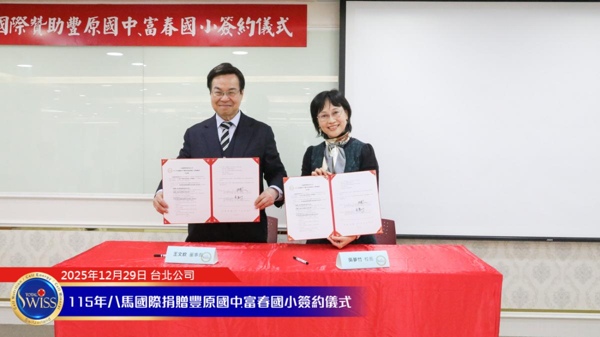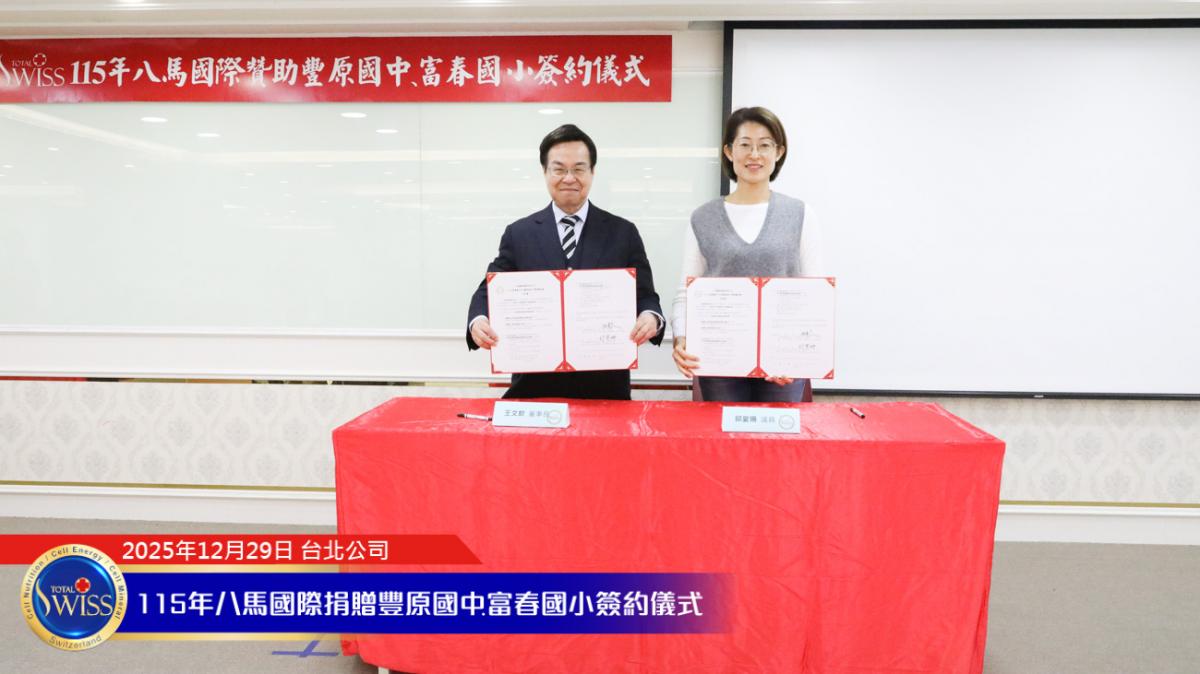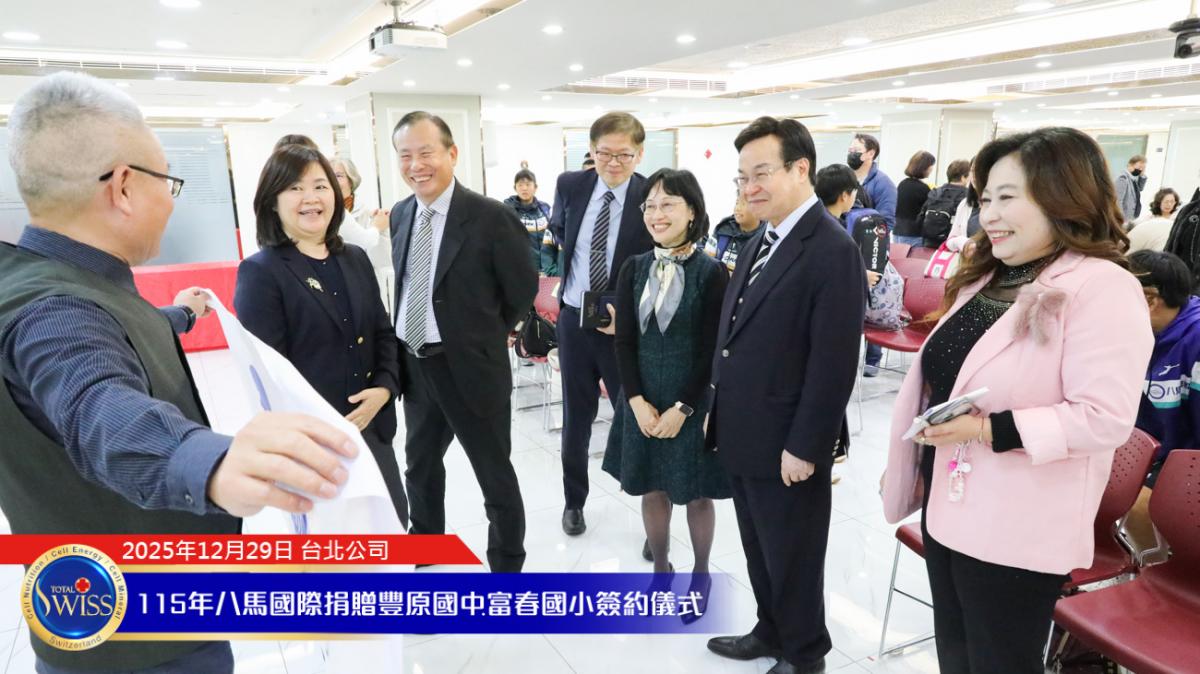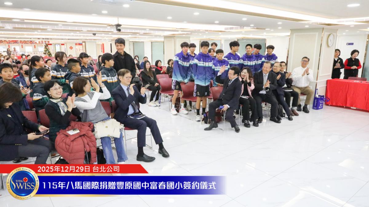 2025 年 12 月 29 日,在百萬抽獎及健康講座之後,台北公司現場隨即舉行 Total Swiss 第五次贊助富春國小飛盤隊,以及第二次贊助豐原國中飛盤隊的簽約儀式。富春國小小選手由吳夢竹校長親自領隊參加;豐原國中及常春藤中學的學長們,則由台中市議員邱愛珊領隊出席。